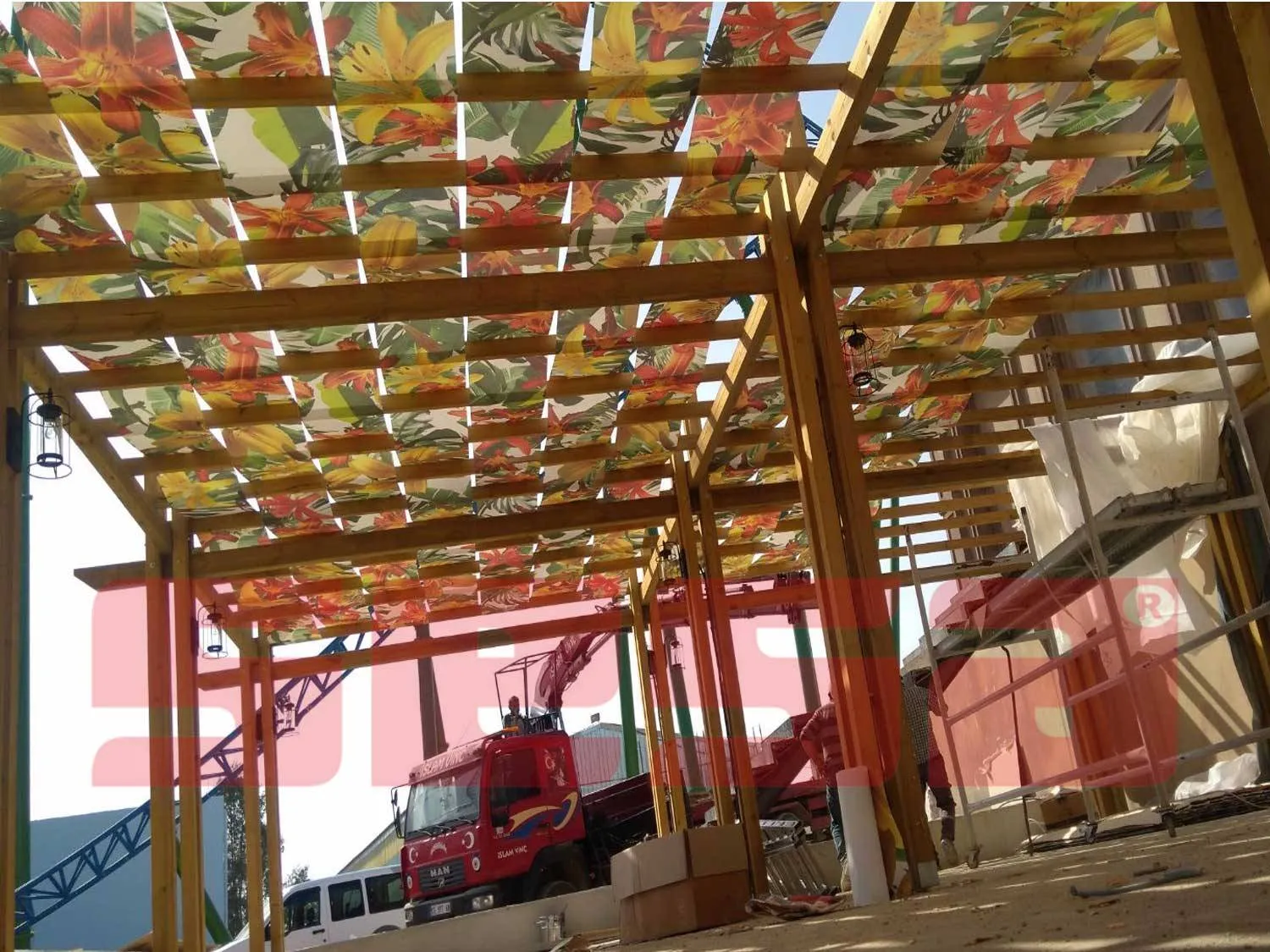 Otel restaurant vafe ve geniş alanlarda ahşap pergole ve çelik konstrüksiyon üzerine monte edilen rüzgar direnvine mukavemetli olan jut gölgelik sistemlerimiz .